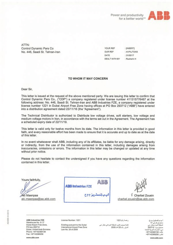 شرکت فنی و مهندسی کنترل دینامیک پارس CDP بعنوان نماینده رسمی ABB در ایران در بخش سافت استارتر، الکتروموتور، درایو (اینورتر) و قطعات یدکی در راستای ارائه مشاوره ، تأمین قطعات و لوازم و خدمات پشتیبانی، تعمیر و راه اندازی قطعات و آموزش ABB با محوریت اتوماسیون صنعتی در زمینه صنایع نفت، گاز، پتروشیمی، سیمان، فولاد، آب و فاضلاب، کاشی، سیم، کابل و… پوشش خود را متمرکز نموده است.